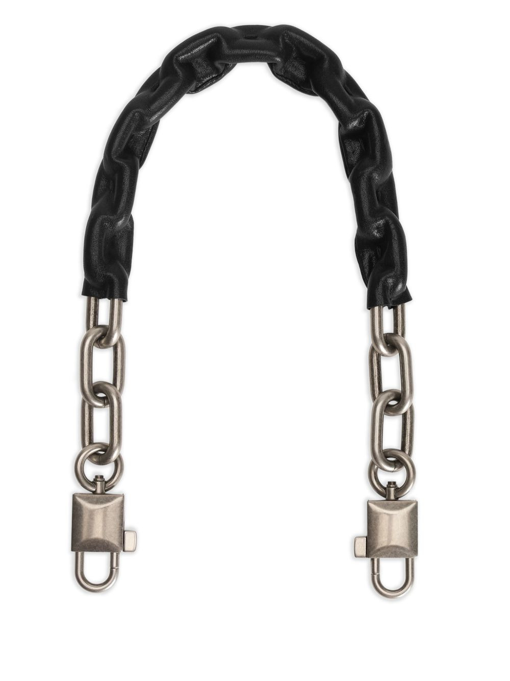 chain bag charm Highlights - Black - Chain construction - Leather detail Made in Italy Composition Brass 60%, Zamak 20%, Calf Leather 20%