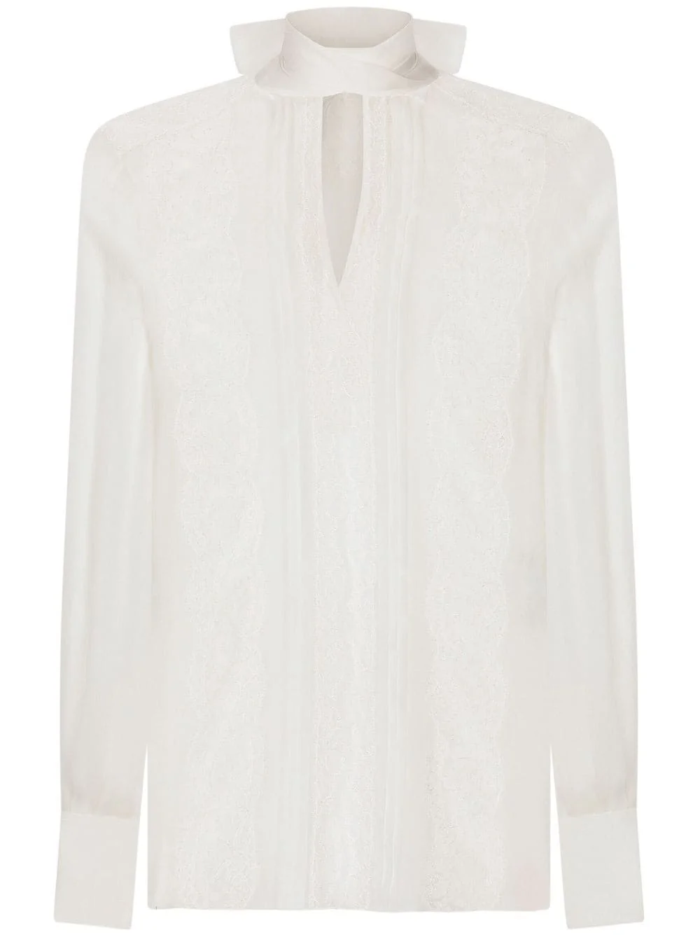 chantilly lace semi-sheer blouse Highlights - White - Silk blend - Semi-sheer construction - Chantilly lace - Pussy-bow collar - Long sleeves - Buttoned-cuff sleeves - Fitted-cuff sleeves - Straight hem Made in Italy Composition Silk 80%, Nylon 11%, Rayon 9%