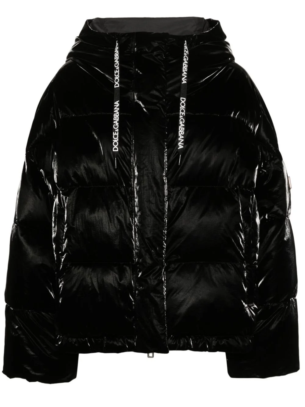 coated-finish puffer jacket Dolce & Gabbana showcases its affinity for relaxed styles and technical fabrics with this puffer jacket. Boasting a coated finish, it features a hood with a logo-print drawstring fastening for a distinctive branding note. Highlights - Black - Quilted - Coated finish - Silver-tone logo plaque - Logo-embossed strap - Slouchy drawstring hood - High neck - Branded zip puller - Concealed front press-stud and zip fastening - Two internal shoulder straps - Drop shoulder - Long sleeves with elasticated cuffs - Two side zip-fastening pockets - Drawstring hem - Full lining Made in Italy Composition Outer: Polyamide 100% Lining: Polyester 100%, Cotton 96%, Polyamide 3%, Elastane 1% SIZE & FIT Model measurements Height 5 ft 11 in(1.8 m) Bust/Chest 34.25 in(87 cm) Hips 35.82 in(91 cm) Waist 24.8 in(63 cm) FittingInformation Designed to be unstructured, offering a loose fit throughout The internal drawstring at the hem allows for fitted preferences Made from a padded non-stretch fabric, giving it no natural elasticity This piece fits true to size – take your usual size Washing instructions Dry Clean Only