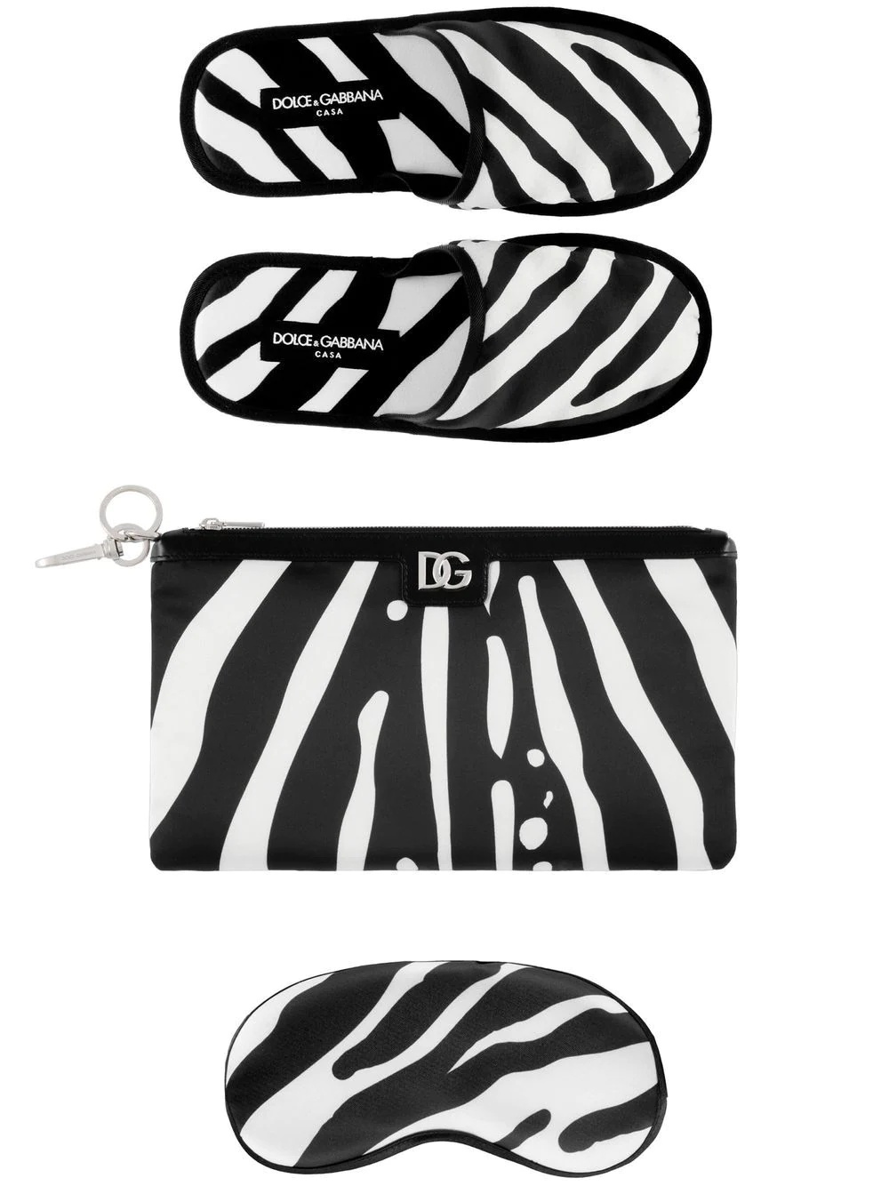 Comfort Kit travel pouch set black/white silk/calf leather zebra print gold-tone logo lettering zip-fastening compartment matching slippers and eye mask Made in Italy Composition Outer: CALFSKIN 100%, Polyester 100%, Viscose 100% Lining: Silk 100% Washing instructions Do Not Wash/Do Not Dry Clean
