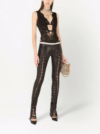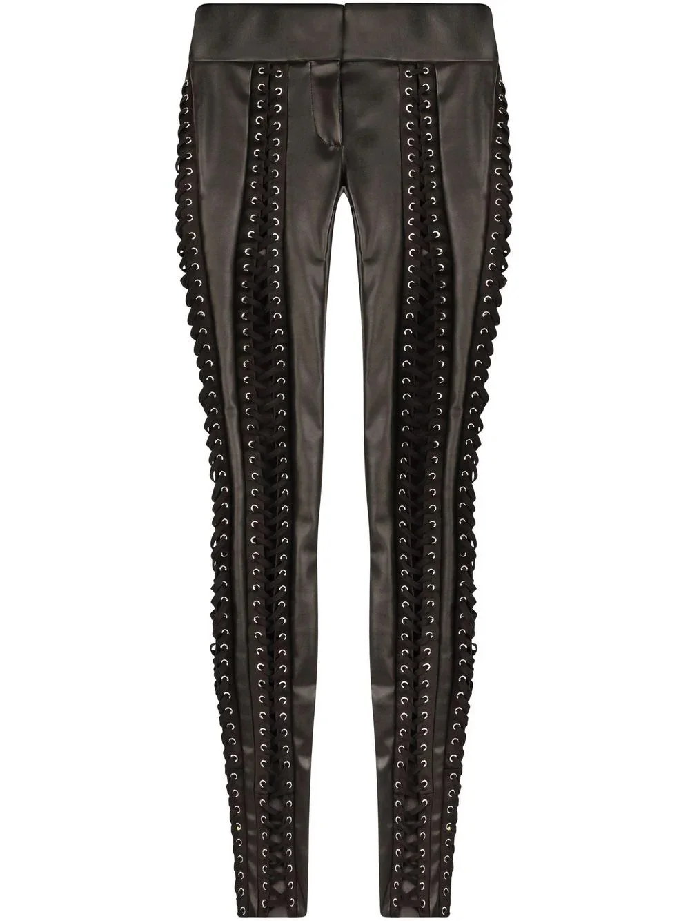 lace-up faux-leather trousers Dolce & Gabbana's SS22 collection sees '90s inspired garments with a contemporary edge. As showcased by these leggings from the offering, they're highlighted by corset-style eyelet detailing for a modern twist. Highlights - Black - Eyelet detailing - Cut-out detailing - Skinny cut - Low-rise Made in Italy Composition Polyurethane 53%, Polyester 42%, Silk 5%