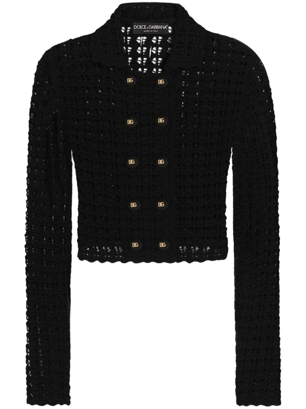 crochet-knit cardigan Highlights - Black - Double-breasted button fastening - Scallop edge - Spread collar - Long sleeves Made in Italy Composition Virgin Wool 100%