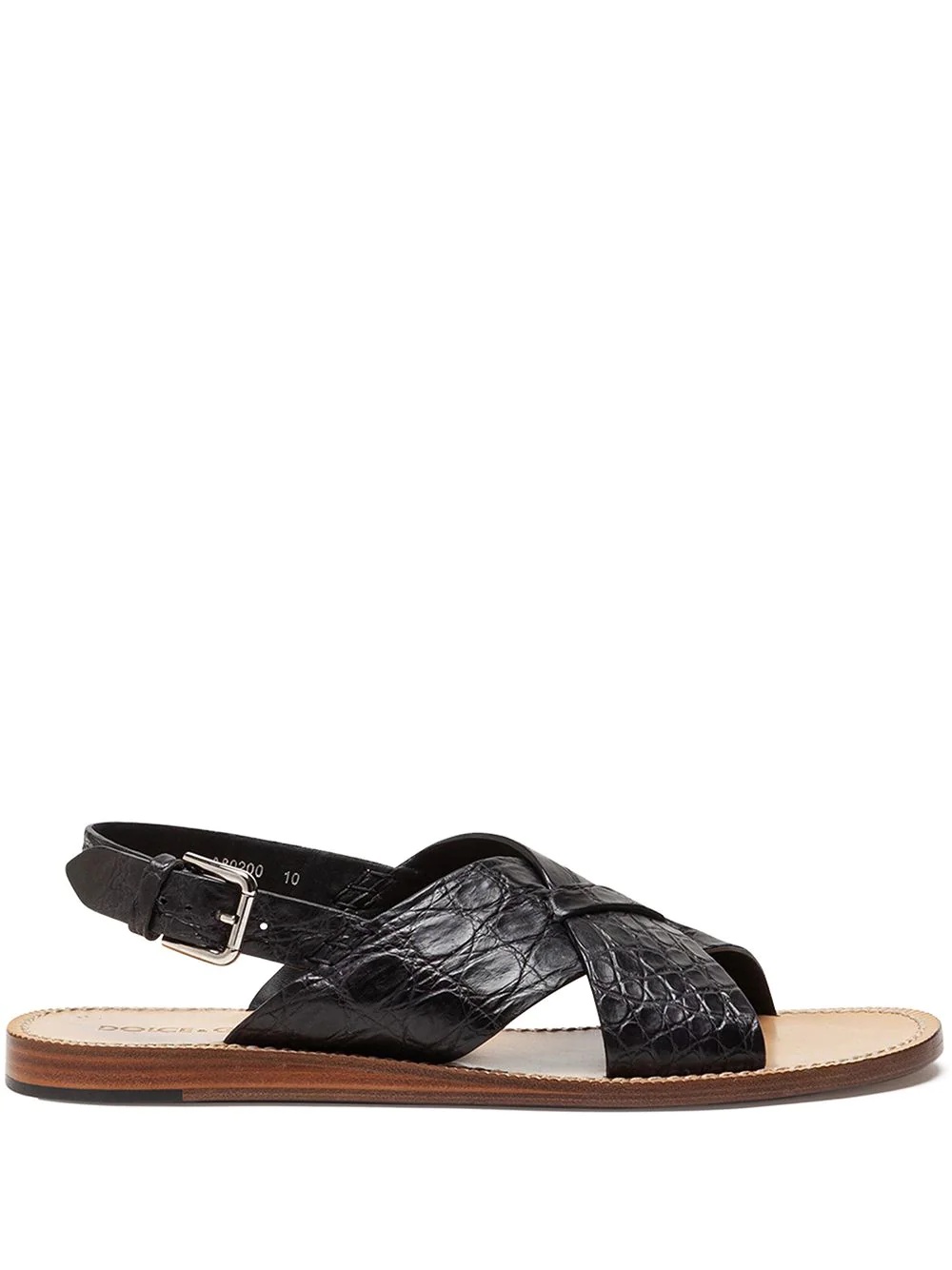 crossover-strap leather sandals The smell of the ocean and the sand in your toes...If you were'nt already dreaming of your summer holiday, you will be with these Dolce & Gabbana crocodile leather crossover strap sandals in your wardrobe. One question: Portofino or Capri? Highlights - Black - Crocodile leather - Crossover strap detail - Open toe - Buckle-fastening slingback strap - Wooden sole - Branded insole Made in Italy Composition Outer: Crocodile Leather 100% Lining: Lambskin 100% Sole: Leather 100%