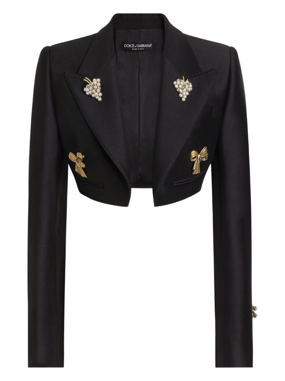 cropped blazer Highlights - Black - Pearl and gold-tone bow embellishments - Peak lapels - Long sleeves - Front opening Made in Italy Composition Virgin Wool 86%, Silk 14% Washing instructions Read Manufacturer Guidelines