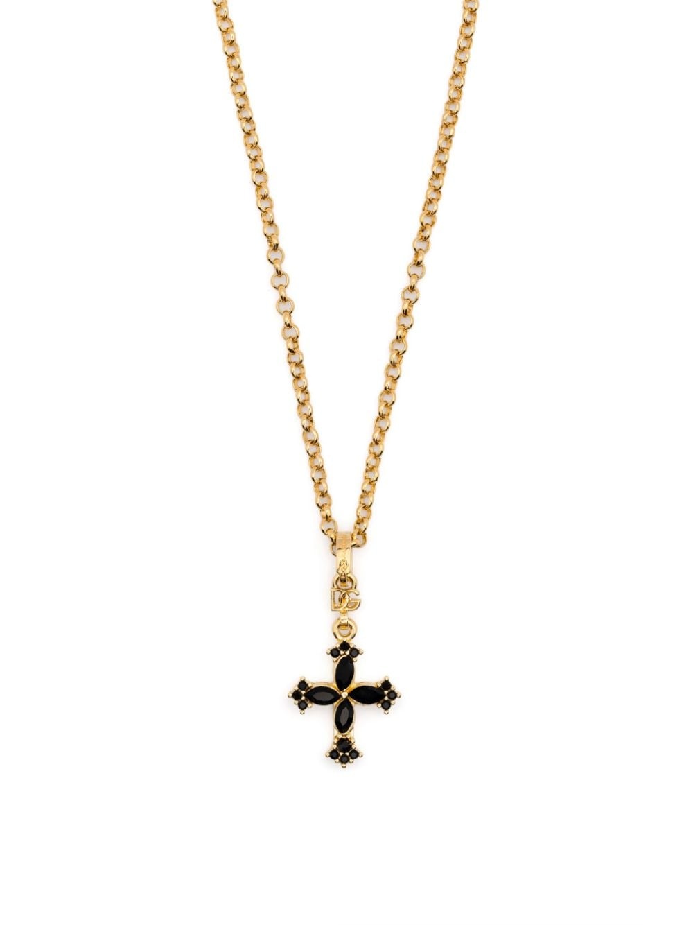 cross-pendant hain necklace Highlights - Gold-tone/black - Brass, glass - Polished effect - Cable-link chain - Cross pendant - Gem embellishment - Logo plaque - Lobster claw fastening - Adjustable fit Made in Italy SIZE & FIT Model measurements Height 5 ft 9 in(1.76 m) Bust/Chest 31.88 in(81 cm) Hips 35.43 in(90 cm) Waist 24.8 in(63 cm) Measurement Length when open 19.68 in(50 cm) Minimum Length 17.71 in(45 cm) PENDANT LENGTH 1.18 in(3 cm) PENDANT WIDTH 0.59 in(1.5 cm)