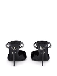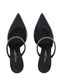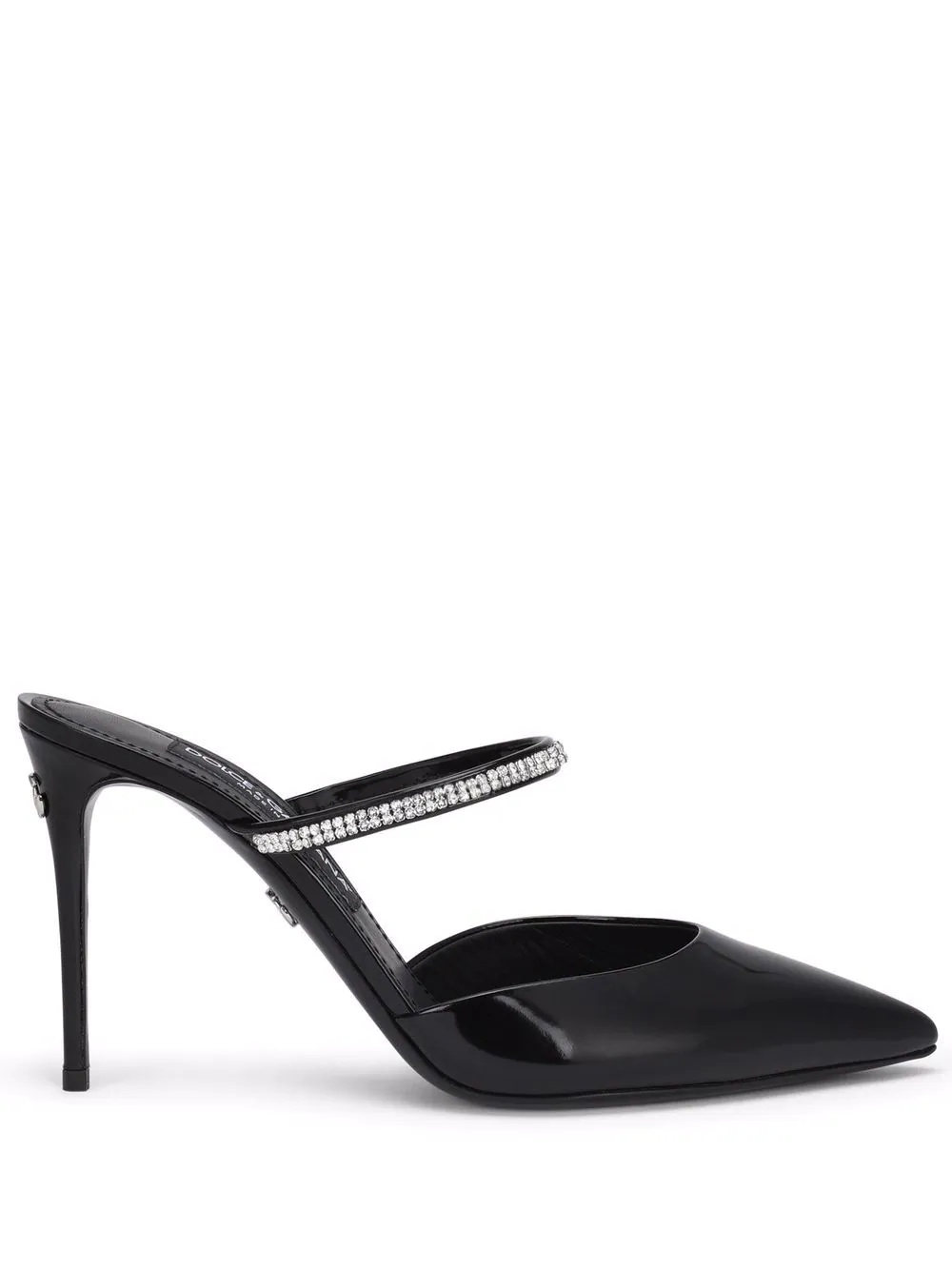 90mm embellished patent leather mules Dolce & Gabbana showcases the brand's signature sense of opulence on this pair of mules from the SS22 collection. Featuring crystal embellishment across the front and a silver-tone logo plaque at the heel, the shoes have an elegant and timeless feel. Highlights - Black - Leather - Pointed toe - Crystal embellishment - Slip-on style - High stiletto heel Made in Italy Composition Outer: Calf Leather 90%, Crystal 8%, Brass 2% Lining: Goat Skin 90%, Calf Leather 10% Sole: Leather 100%