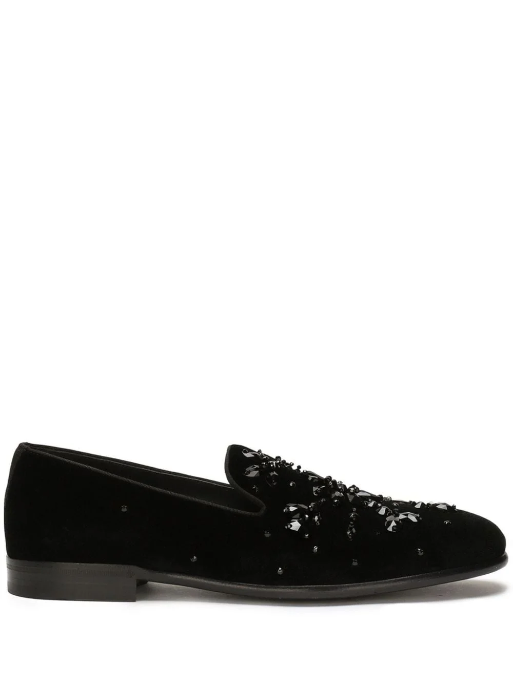 crystal-embellished velvet slippers Highlights - Black - Velvet - Crystal embellishment - Tonal design - Almond toe - Slip-on style - Branded leather insole - Flat leather sole Made in Italy Composition Outer: Viscose 52%, Cotton 46%, Modal 2% Lining: Calf Leather 87%, Goat Skin 13% Sole: Calf Leather 100%