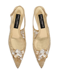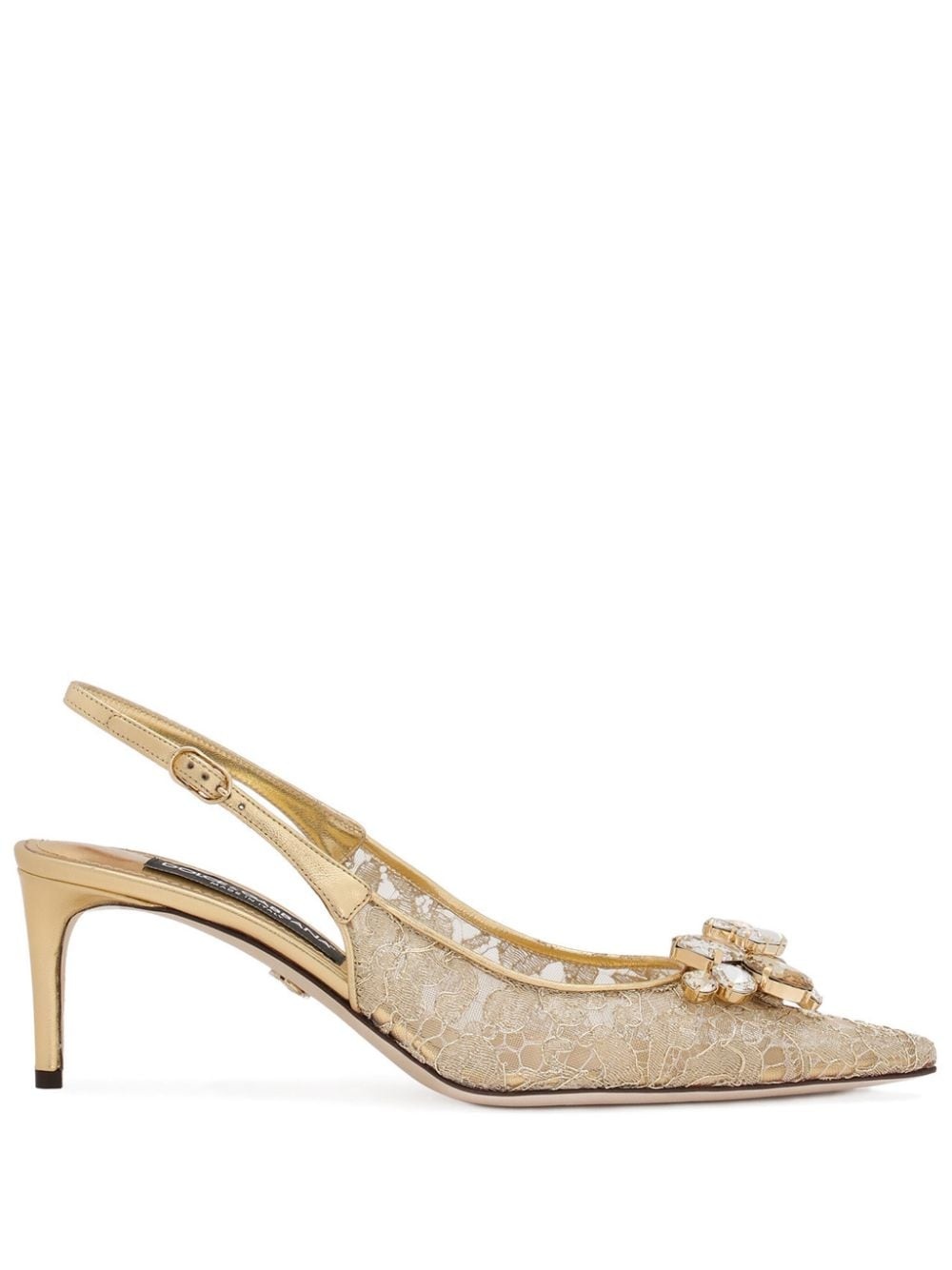 60mm Rainbow slingback pumps Crafted by Italian artisans, these Dolce & Gabbana pumps embody an opulent look with their gold-tone lace construction. Shimmering crystals adorn the front, while a delicate slingback strap secures the pointed silhouette, adding a touch of elegance. Highlights - Gold-tone - Sheer lace detailing - Crystal embellishment - Gold-tone logo plaque - Buckle-fastening slingback strap - Pointed toe - Branded leather insole - Leather sole - 60mm heel Made in Italy Composition Sole: Calf Leather 100% Outer: Nylon 52%, Lambskin 38%, Polyester 10% Lining: Calf Leather 100%