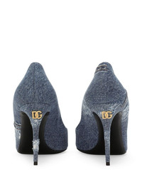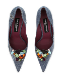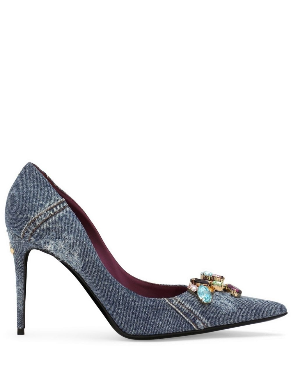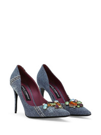denim-patchwork leather pumps Highlights - Dark blue - Calf leather - Stretch-cotton - Denim patchwork design - Distressed effect - Gemstone detailing - Gold-tone logo plaque - Pointed toe - Branded insole - High heel Made in Italy Composition Cotton 100%