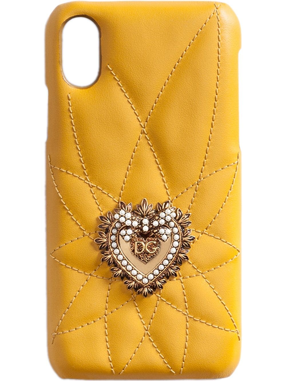 Devotion iPhone X case Dolce & Gabbana's Devotion iPhone X phone case is dressed in mustard yellow matelasse calf leather. It features the label's signature embellished heart to its centre. Let everyone see how devoted you are. Highlights - Mustard yellow - Matelasse calf leather - Tonal stitching - Gold-tone hardware - Handmade heart with dg logo and faux pearl inlays Made in Italy Composition Outer: Calf Leather 90%, Plastic 10% Lining: Polyurethane 70%, Nylon 20%, Plastic 10% SIZE & FIT Measurement DEPTH 0.39 in(1 cm) LENGTH 2.95 in(7.5 cm) WIDTH 5.7 in(14.5 cm)