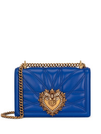 medium Devotion quilted shoulder bag Dolce & Gabbana presents this Devotion shoulder bag in a striking maximalist design. Presented in bright blue smooth leather, the quilted technique leads to the gilded centrepiece of the style-the brand's embellished Sacred Heat logo plaque. Highlights - Blue - Lambskin - Quilted - Signature sacred heart plaque - Gold-tone hardware - Sliding chain-link shoulder strap - Foldover top - Clasp fastening - Main compartment - Internal zip pocket - Internal logo plaque - Leopard print lining - This piece comes complete with a protective dust bag. Made in Italy Composition Outer: Lambskin 100% SIZE & FIT Measurement DEPTH 3.14 in(8 cm) HEIGHT 5.9 in(15 cm) WIDTH 7.87 in(20 cm)