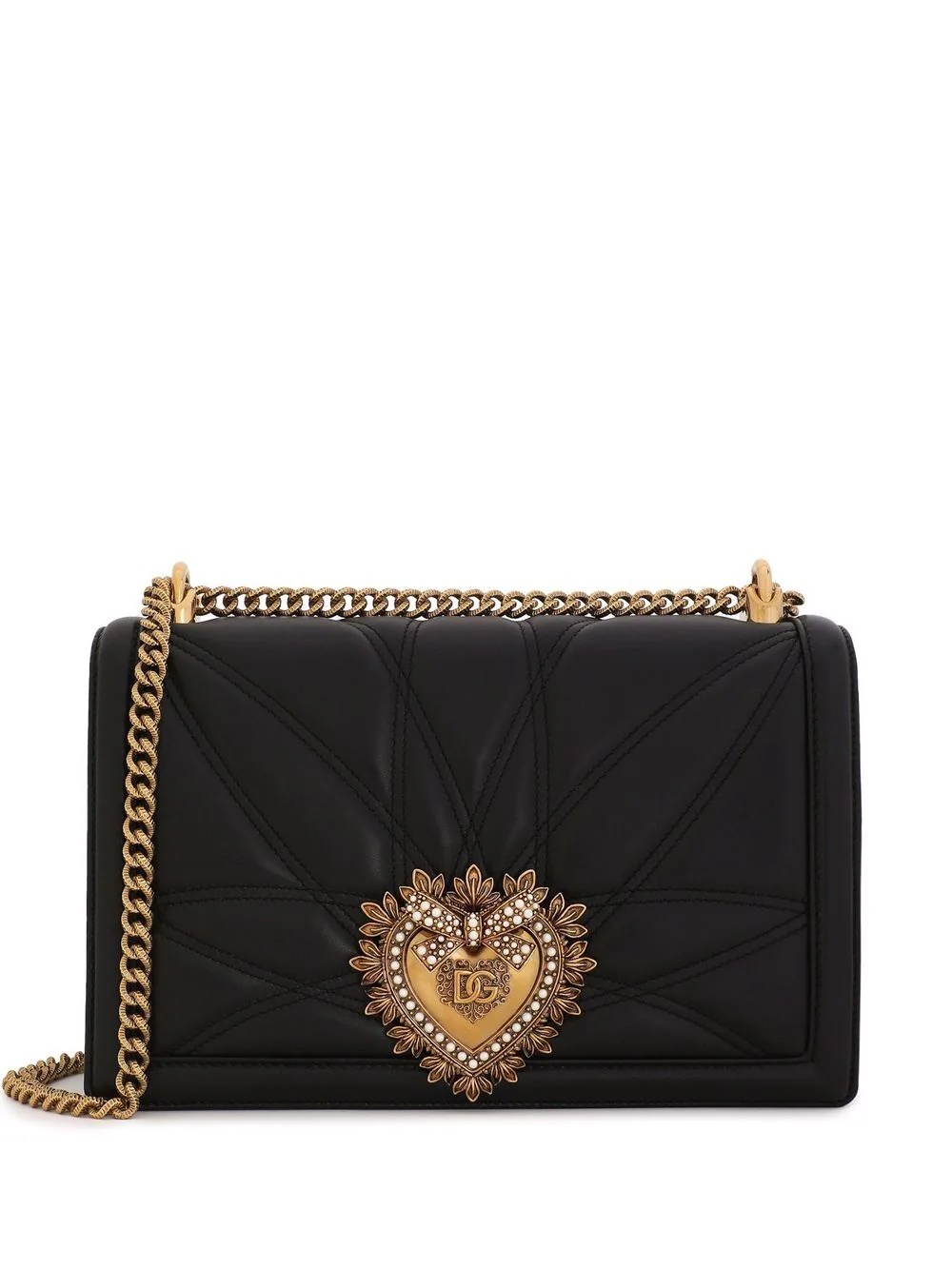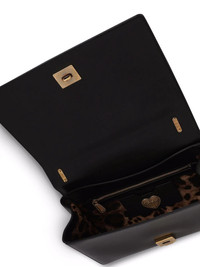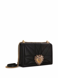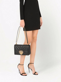 large Devotion shoulder bag Dolce & Gabbana are the height of romanticism, as expressed through their trademark sacred heart motif that appears emblazoned across ready-to-wear and accessories for countless seasons. This versatile Devotion shoulder bag is crafted from black leather and features an adjustable chain shoulder strap with a Nappa leather insert - so it can be worn over the shoulder or across the body. Highlights - Black - Lambskin - Signature sacred heart plaque - Quilted finish - Foldover top - Clasp fastening - Main compartment - Internal zip-fastening pocket - Sliding chain-link shoulder strap - Internal card slot - Leopard print lining - This piece comes complete with a protective dust bag. Made in Italy Composition Lining: Lambskin 55%, Cotton 45% Outer: Lambskin 100% SIZE & FIT Measurement STRAP 20.86 in(53 cm) DEPTH 2.75 in(7 cm) WIDTH 10.23 in(26 cm) HEIGHT 5.7 in(14.5 cm)