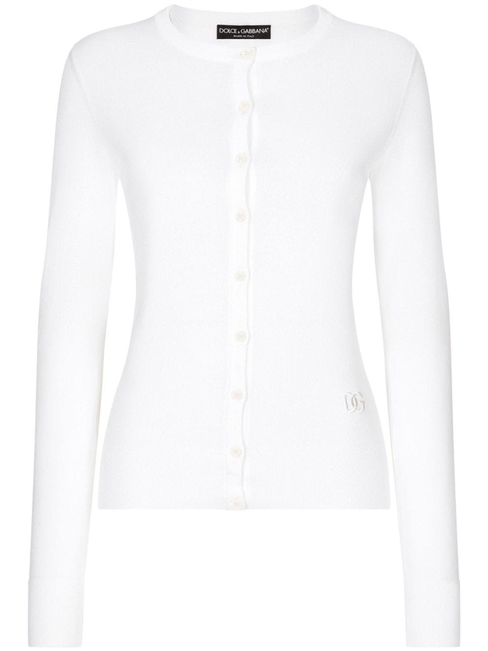 DG-embroidered fine-knit cardigan Highlights - White - Silk blend - Fine knit - Crew neck - Front button fastening - Embroidered logo to the front - Long sleeves - Ribbed-knit edge Made in Italy Composition Silk 90%, Polyamide 10% Washing instructions Read Manufacturer Guidelines