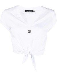 DG knot-front T-shirt white cotton logo plaque V-neck short sleeves knot detailing cropped Made in Italy Composition Cotton 100% SIZE & FIT Model measurements Height 5 ft 10 in(1.77 m) Bust/Chest 31.49 in(80 cm) Hips 33.85 in(86 cm) Waist 22.44 in(57 cm) FittingInformation Designed for a close fit throughout Washing instructions Machine Wash