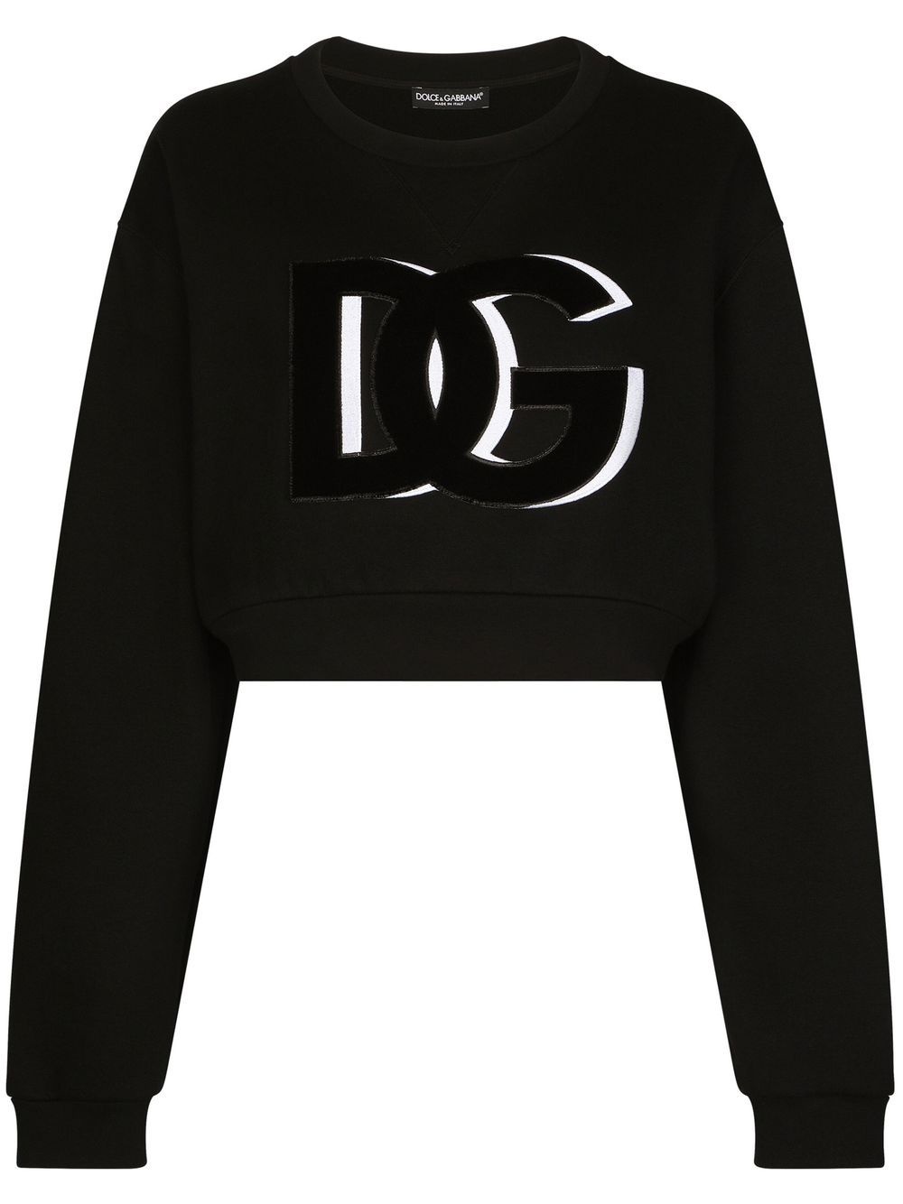 DG-logo cropped sweatshirt Made in Italy from a soft blend of cotton, this cotton crew neck sweatshirt is embellished with a velvet-finish logo at the centre and cut for a cropped length evocative of Dolce & Gabbana's contemporary take on athleisure-inspired silhouettes for SS23. Highlights - Dg logo cropped sweatshirt from dolce & gabbana featuring black, cotton blend, embroidered logo to the front, crew neck, cropped and long sleeves. Made in Italy Composition Cotton 94%, Nylon 6%
