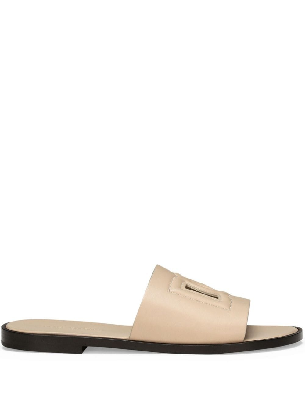 embossed-logo leather slides Highlights - Beige - Leather - Perforated logo detail - Open toe - Slip-on style - Branded insole - Flat leather sole Made in Italy Composition Lining: CALFSKIN 70%, Lambskin 30% Outer: CALFSKIN 100% Sole: Leather 100% SIZE & FIT Measurement HEEL 0.59 in(1.5 cm) Sole height 0.39 in(1 cm)