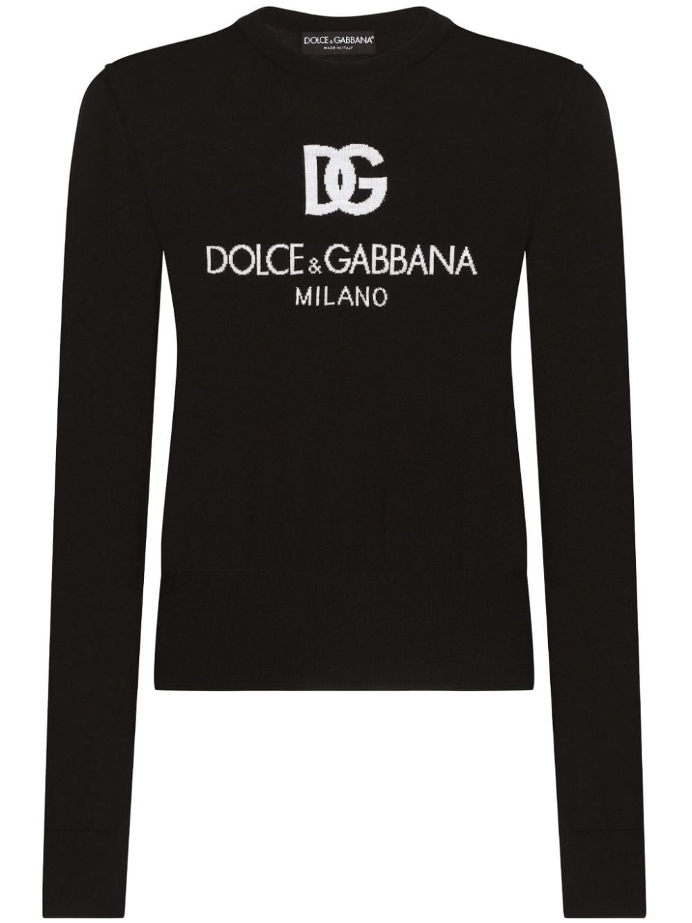 DG Milano long-sleeve top Dolce & Gabbana's DG Milano logo takes the focus of this black top from the brand's SS24 collection. The detail appears at the front, in a white colour, contrasting with the rest of its virgin wool construction. Highlights - Black - Virgin wool - Intarsia-knit logo - Round neck - Long sleeves - Straight hem Made in Italy Composition Virgin Wool 100% Washing instructions Read Manufacturer Guidelines