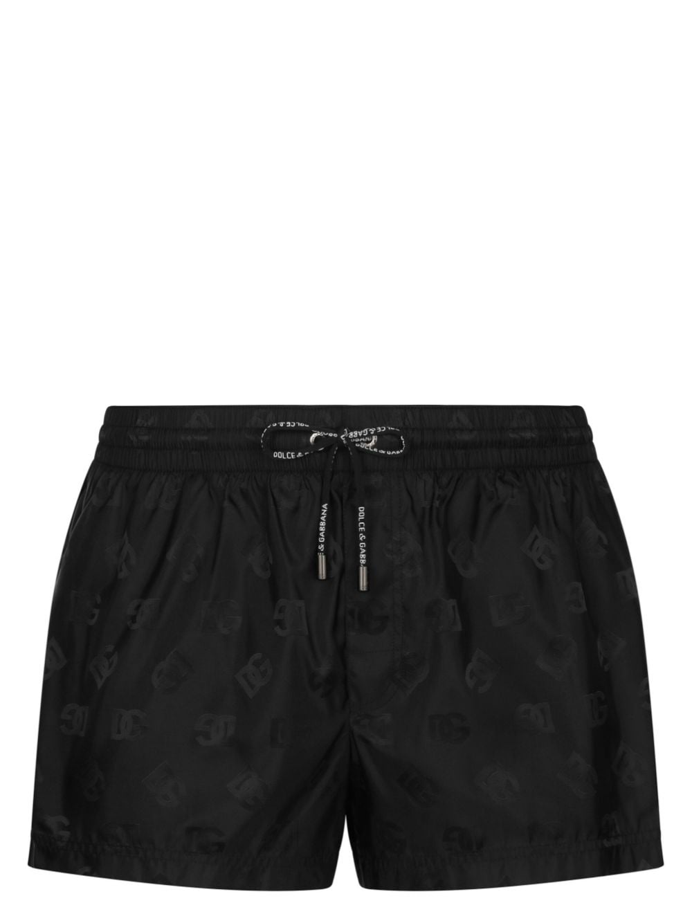 DG monogram-print swim shorts Highlights - Jet black - Monogram print - Elasticated drawstring waistband - Two side inset pockets - Rear zip-fastening pocket - Straight hem - Thigh-length - Be mindful to try on swimwear over your own garments. Made in Italy Composition Inner: Polyamide 85%, Elastane 15% Outer: Polyester 100%
