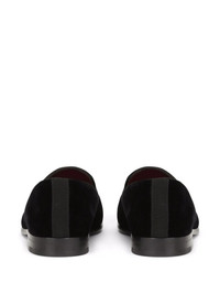 DG-logo velvet slippers Dolce Gabbana's lustrous aesthetic is evidenced by the velvet construction of these slippers. Signature DG logo lettering adds a touch of logomania to the pair. Highlights - Black cotton velvet dg-plaque velvet slippers from dolce & gabbana featuring gold-tone logo lettering, almond, slip-on style, silk lining, branded insole and flat leather sole. Made in Italy Composition Outer: Cotton 100% Lining: Goat Skin 60%, Cotton 40% Sole: Leather 100%