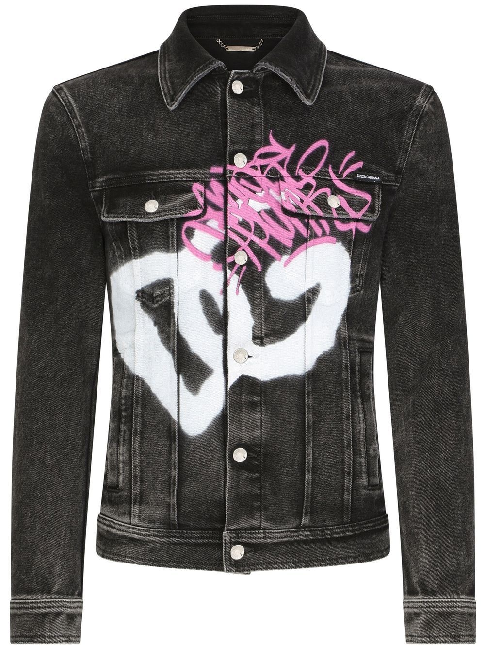 DG spray-print denim jacket black/bubblegum pink/off-white stretch-cotton logo print to the front straight-point collar front button fastening long sleeves buttoned cuffs two chest flap pockets two side slit pockets straight hem Made in Italy Composition Outer: Cotton 98%, Elastane 2%