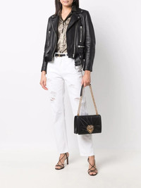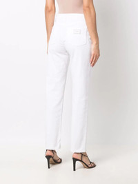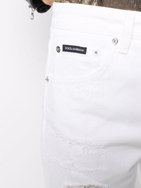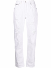 distressed boyfriend jeans Finished in a contemporary tonal white colourway, these Dolce & Gabbana jeans are cut for a relaxed boyfriend fit and distressed detailing for a casual look. The pair is finished with a logo plaque on the rear pocket. Made in Italy Composition Cotton 97%, Zamak 60%, Calf Leather 40%, Elastane 3% SIZE & FIT Model measurements Height 5 ft 11 in(1.8 m) Bust/Chest 33.07 in(84 cm) Hips 37.4 in(95 cm) Waist 25.19 in(64 cm) Measurement FRONT RISE 10.43 in(26.5 cm) FittingInformation This piece fits true to size. We recommend you get your regular size Designed to be fitted at the waist and hips, loose over the leg Made with a mid-weight stretch fabric Washing instructions Machine Wash