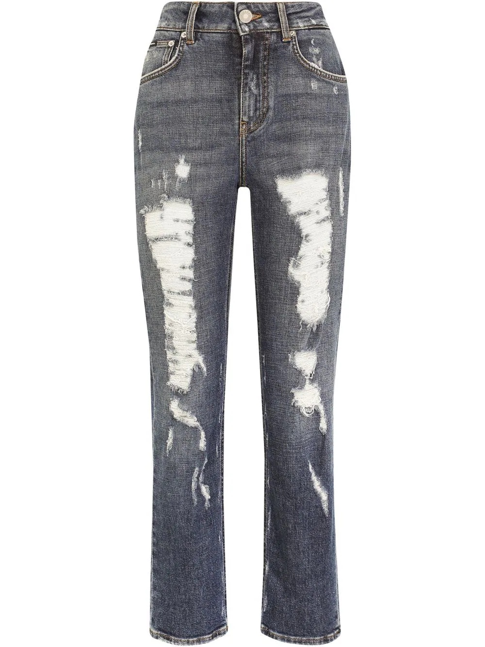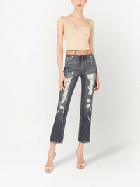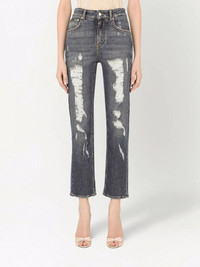 distressed boyfriend jeans Drawing inspiration from the '90s with a cropped silhouette, these jeans from Dolce & Gabbana evoke a vintage effect thanks to the tattered construction. Highlights - Blue stretch cotton denim distressed cropped jeans from dolce & gabbana featuring distressed effect, logo plaque, whiskering effect at the thighs, button fly fastening, belt loops, classic five pockets and cropped leg. Made in Italy Composition Cotton 98%, Spandex/Elastane 2%