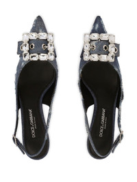 Patchwork denim slingbacks with rhinestone buckle