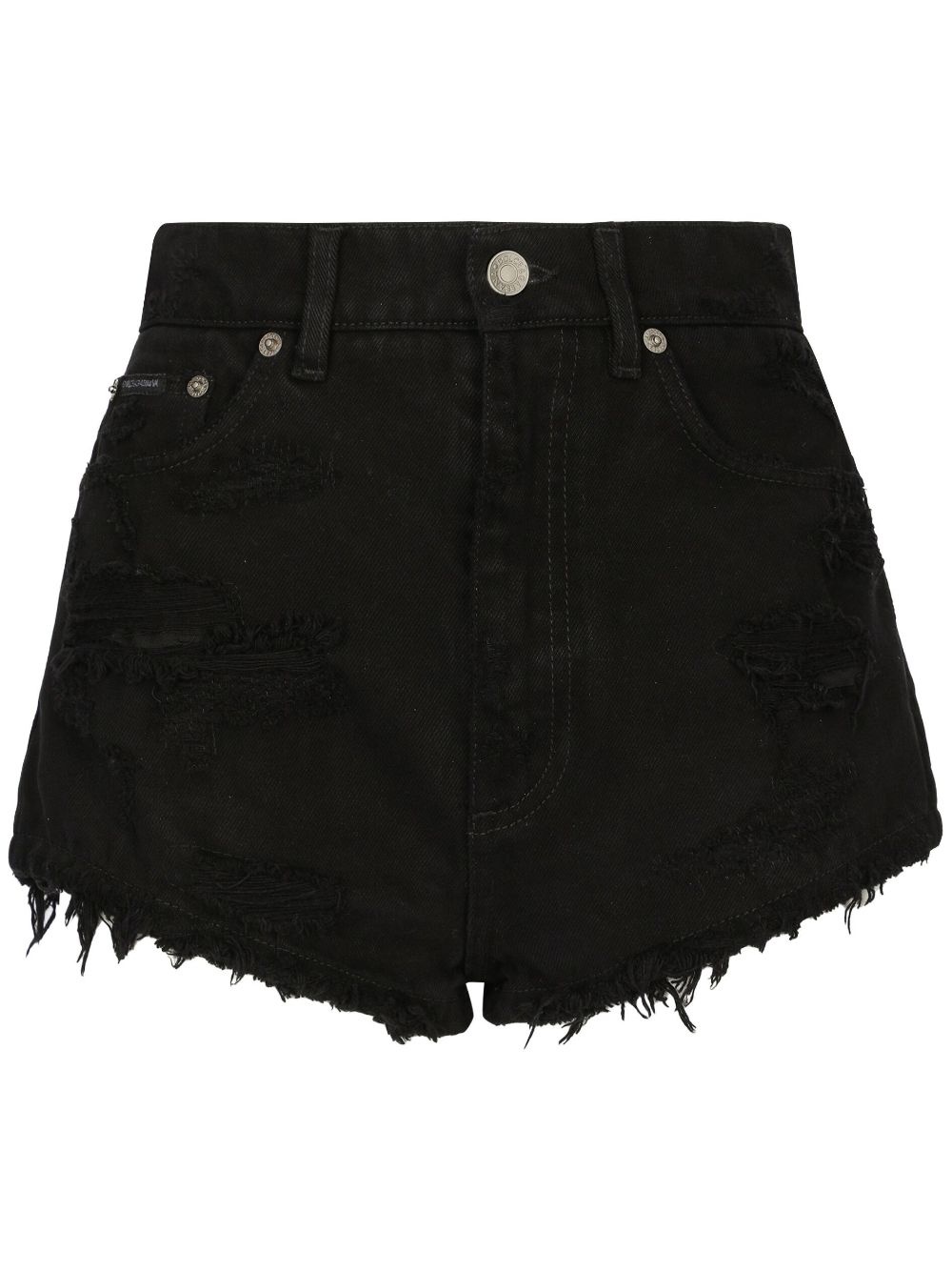 distressed-effect denim shorts Highlights - Jet black - Cotton - Denim - High-waisted - Logo plaque - Belt loops - Front button and zip fastening - Classic five pockets - Thigh-length - Frayed hem Made in Italy Composition Cotton 100% Washing instructions Read Manufacturer Guidelines