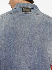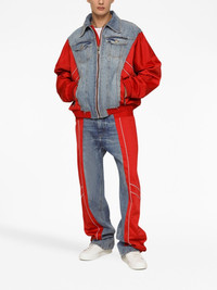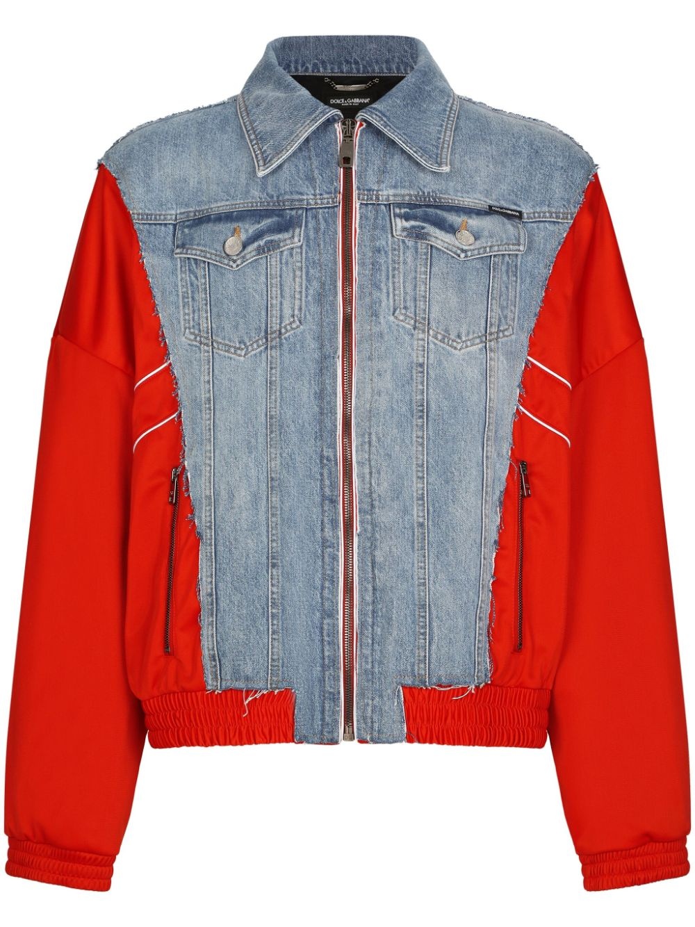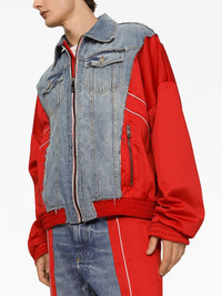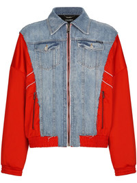 distressed-effect panelled denim jacket Highlights - Blue/red - Denim - Distressed effect - Front zip fastening - Two front flap pockets - Panelled design - Classic collar - Long sleeves - Elasticated hem Made in Italy Composition Nylon 50%, Polyester 50% Body: Polyester 60%, Cotton 40%