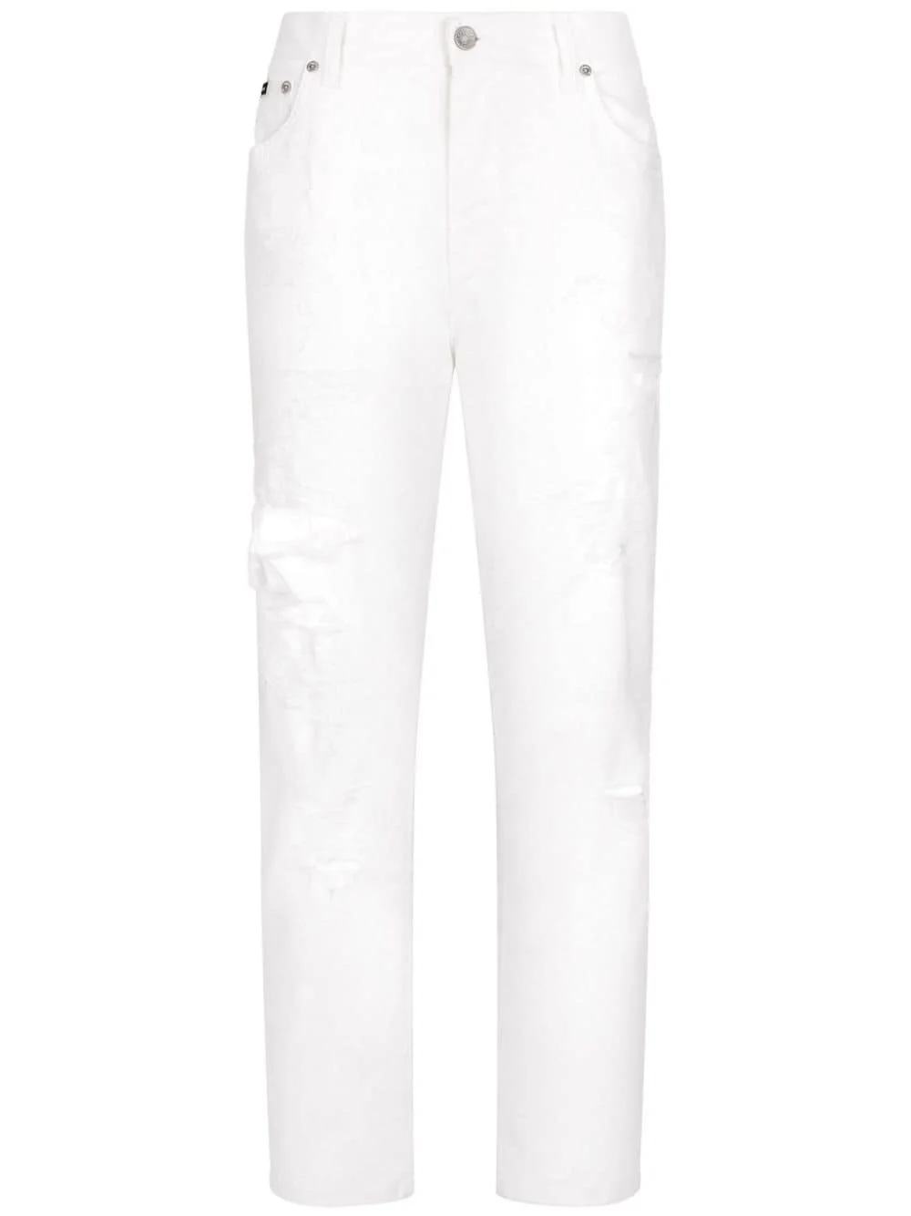distressed-finish straight jeans Highlights - White - Stretch-cotton - Denim - Distressed finish - Applique logo - Belt loops - Concealed fly and button fastening - Straight leg Made in Italy Composition Cotton 97%, Elastane 3%