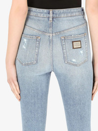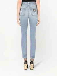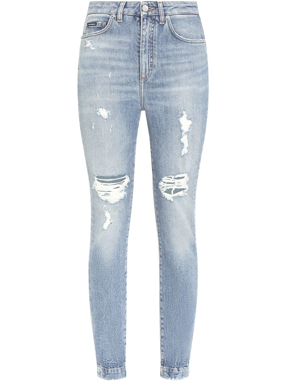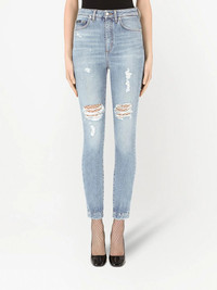 Audrey distressed skinny jeans Dolce & Gabbana is bringing distressed to the forefront. These skinny jeans are designed with a faded effect and ripped detailing that exudes laidback cool. Highlights - Light blue - Cotton blend - Mid-rise - Belt loops - Button fly fastening - Classic five pockets - Silver-tone stud detailing - Faded effect - Cropped - Rear logo plaque Made in Italy Composition Cotton 98%, Elastane 2%