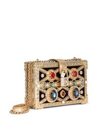 Dolce Box bejewelled top-handle bag There's no such thing as too much jewellery - or bags. Adorned with gemstone embellishments, this jewelled Dolce Box bag from Dolce & Gabbana gives you the best of both worlds. And your collection keeps growing... Highlights - Gold-tone/purple/multicolour - Calf leather trim - Gemstone detailing - Gold-tone stud detailing - Padlock detail with floral applique - Detachable chain-link shoulder strap - Concealed magnetic fastening - Main compartment - Internal logo plaque - Calf leather lining - Metal feet Made in Italy Composition Outer: Calf Leather 72%, Cotton 28%