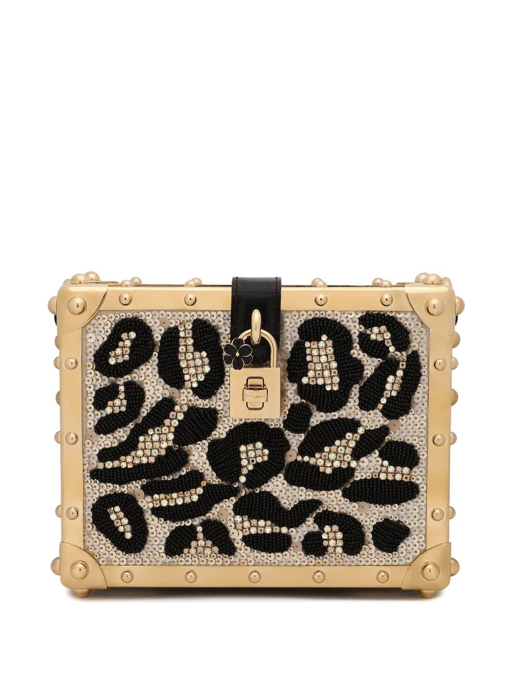 Satin Dolce Box top-handle bag Highlights - Gold-tone/black - Satin weave - Sequin embellishment - Bead detailing - Embroidered motif - Stud detailing - Gold-tone hardware - Adjustable detachable shoulder strap - Padlock fastening - Main compartment - Internal slip pocket - Internal logo plaque - Leather lining Made in Italy Composition Outer: Rayon 48%, Calf Leather 30%, Silk 22% Lining: Calf Leather 95%, Wood 5%