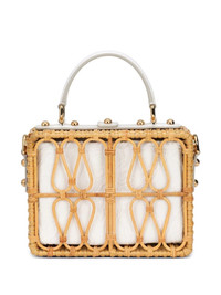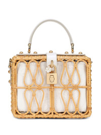 Dolce Box wicker top-handle bag Designed with mini proportions, this compact Dolce Box wicker tote bag from Dolce & Gabbana has a woven construction. The top-handle style opens up to a small main compartment with a patch pocket. Highlights - Brown/white - Woven wicker design - Brocade effect - Gold-tone hardware - Single top handle - Adjustable detachable shoulder strap - Buckle fastening - Main compartment - Internal patch pocket - This piece comes complete with a protective dust bag. Made in Italy Composition Outer: Vegetable Fibres 60%, Calf Leather 18%, Cotton 13%, Silk 7%, Rayon 2% Lining: Cotton 65%, Silk 26%, Rayon 9%