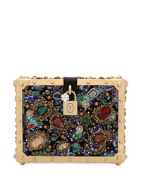 Jacquard Dolce Box top-handle bag Highlights - Gold-tone/multicolour - Jacquard - Gemstone detailing - Gold-tone logo plaque - Gold-tone hardware - Detachable shoulder strap - Padlock fastening - Main compartment - Internal slip pocket - Internal logo stamp - Leather lining Made in Italy Composition Outer: Polyester 35%, glass 25%, Calf Leather 10%, PVC 10%, Acetate 10%, Cotton 5%, Nylon 5% Lining: Calf Leather 95%, Wood 5% SIZE & FIT Measurement DEPTH 3.14 in(8 cm) HANDLE 5.9 in(15 cm) WIDTH 7.87 in(20 cm) STRAP 9.05 in(23 cm)