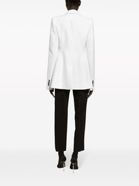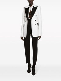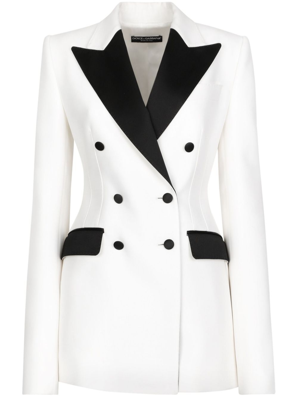 double-breasted blazer Highlights - White/black - Virgin wool blend - Dart detailing - Peak lapels - Double-breasted button fastening - Long sleeves - Buttoned cuffs - Chest welt pocket - Two front flap pockets - Straight hem Made in Italy Composition Virgin Wool 71%, Silk 25%, Polyester 4% Washing instructions Read Manufacturer Guidelines