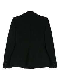 double-breasted blazer Highlights - Black - Virgin wool blend - Crepe texture - Dart detailing - Fabric-covered buttons - Internal padded panels with press-stud fastening at the waist - Wide peak lapels - Shoulder pads - Long sleeves with faux-buttoned cuffs - Italian rear vents - Two front flap pockets - Double-breasted button fastening - Straight hem - Full lining Made in Italy Composition Outer: Virgin Wool 80%, Polyamide 37%, Elastane 3% Lining: Polyester 100%, Silk 92%, Elastane 8%