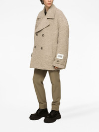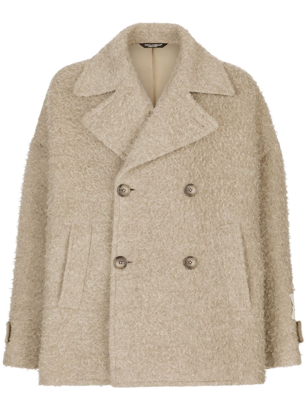 double-breasted brushed peacoat Dolce & Gabbana presents Re-Edition, a deep dive into the label's rich archives to reimagine iconic styles from the '90s with a contemporary twist. Inspired by a peacoat first seen in the 1992 collection, this iteration is spun from a brushed virgin wool blend and cut for a loose, boxy fit. A logo patch appears at the left sleeve for a signature sign off. Highlights - Beige - Virgin wool blend - Brushed effect - Notched lapels - Double-breasted button fastening - Two side slit pockets - Long sleeves - Logo patch at the sleeve - Straight hem Made in Italy Composition Outer: Virgin Wool 56%, Cotton 42%, Elastane 2% Lining: Rayon 100%