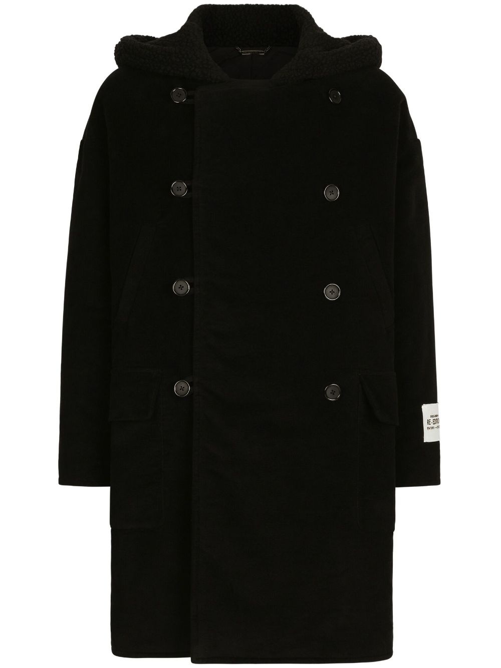 double-breasted cotton coat Highlights - Black - Cotton - Logo patch at the sleeve - Slouchy hood - Double-breasted button fastening - Long sleeves - Two side flap pockets - Thigh-length - Straight hem Made in Italy Composition Cotton 100%