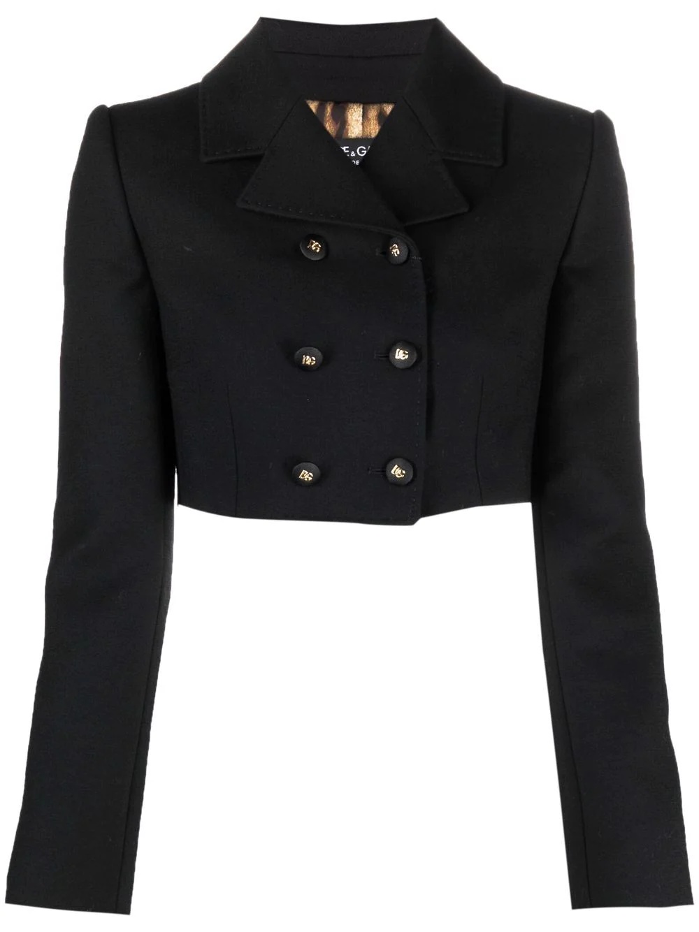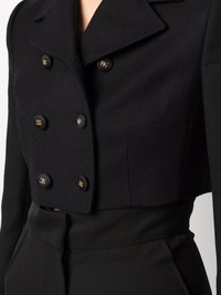 double-breasted cropped jacket black virgin wool tonal design notched collar long sleeves front button fastening cropped Made in Italy Composition Lining: Polyester 97%, Spandex/Elastane 3% Outer: Virgin Wool 100% SIZE & FIT Model measurements Height 5 ft 10 in(1.78 m) Bust/Chest 31.49 in(80 cm) Hips 36.22 in(92 cm) Waist 25.59 in(65 cm) Washing instructions Dry Clean Only