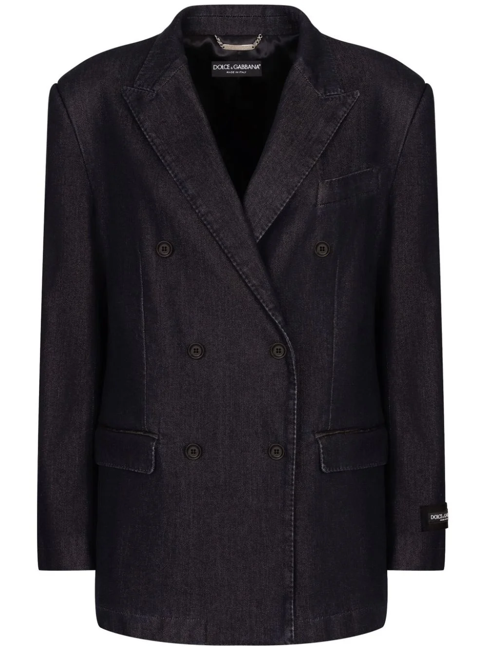 double-breasted peak-lapel jacket Highlights - Charcoal - Peak lapels - Internal silver-tone chain logo - Logo tag on sleeve - Double-breasted button fastening - Long sleeves - Buttoned-cuff sleeves - Chest welt pocket - Two front flap pockets Made in Italy Composition Outer: TENCEL™ 43%, Cotton 28%, Modal 22%, Silk 5%, Spandex/Elastane 2% Lining: Viscose 100%