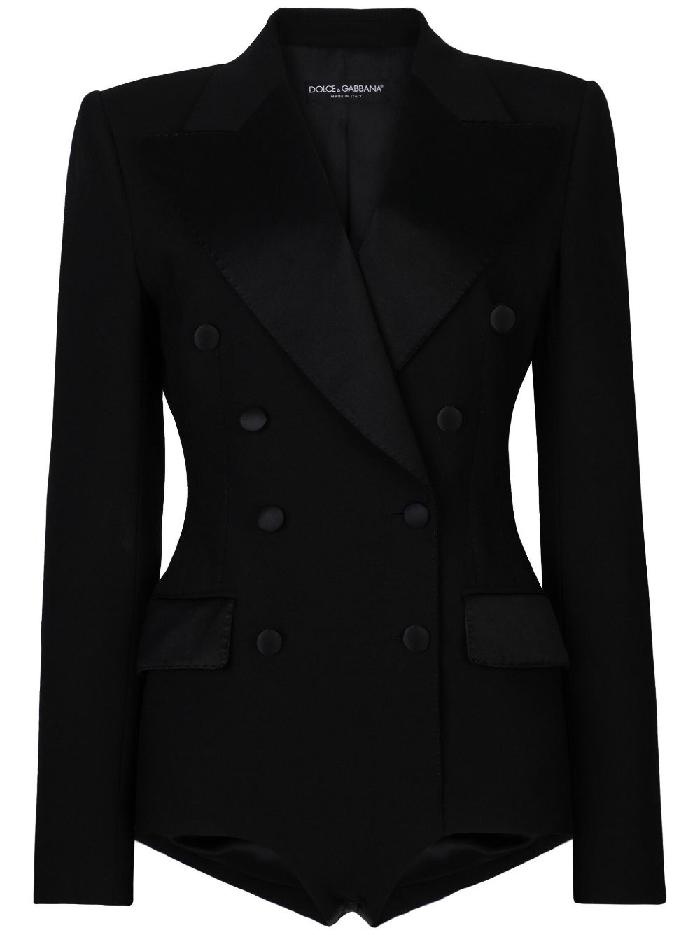 double-breasted playsuit blazer Highlights - Black - Virgin wool blend - Peak lapels - Double-breasted button fastening - Long sleeves - Two side flap pockets - Buttoned cuffs Made in Italy Composition Virgin Wool 79%, Silk 16%, Polyester 4%, Spandex/Elastane 1% Washing instructions Read Manufacturer Guidelines