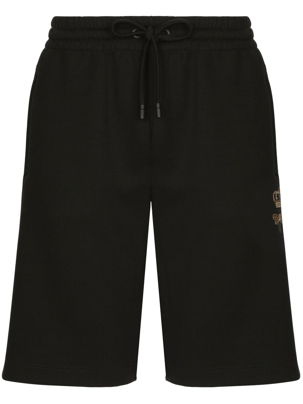 embroidered track shorts Highlights - Drawstring-waist cotton-blend track shorts from dolce & gabbana featuring black, cotton blend, jersey fleece, embroidered logo, drawstring fastening waist, knee-length and two side slit pockets. Made in Italy Composition Cotton 71%, Polyester 29% SIZE & FIT FittingInformation Designed for relaxed fit, offering a comfortable loose fit over the leg Adjust this piece’s waistband to your preference using the drawstring Made from a midweight non-stretch fabric, this piece offers minimal elasticity when worn This piece fits true to size – take your usual size