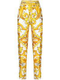 drawstring-waist silk track pants Highlights - Yellow/white - Silk - Twill weave - Majolica print - Elasticated drawstring waistband - Two side welt pockets - Two side slit pockets - Tapered leg Made in Italy Composition Silk 100% SIZE & FIT Measurement FRONT RISE 11.02 in(28 cm) INSIDE LEG 32.28 in(82 cm) HIPS 40.15 in(102 cm) WAIST 32.28 in(82 cm) FittingInformation Designed for a slim fit, these trousers offer a close fit at the waist, allowing a comfortable close fit and some movement over the leg The elasticated waist allows for a comfortable fit