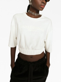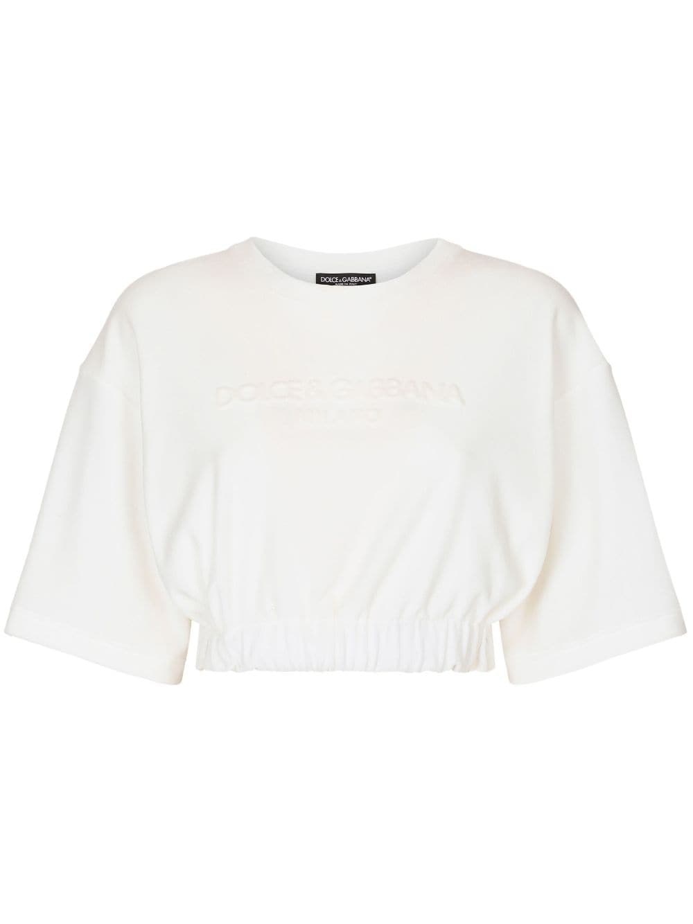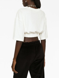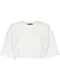elasticated-waistband cotton-blend T-shirt Highlights - Off-white - Cotton blend - Jersey texture - Round neck - Short sleeves - Elasticated waistband - Cropped - Straight hem Made in Italy Composition Cotton 90%, Nylon 10% Washing instructions Read Manufacturer Guidelines