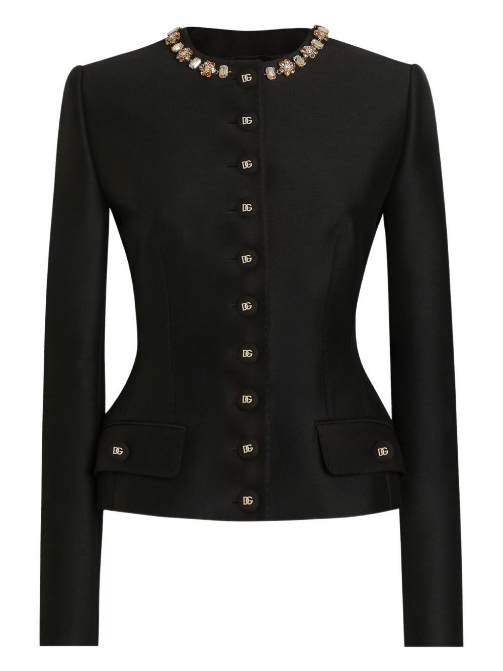 DNA embellished button-up jacket Highlights - Black - Crystal-embellished collar - Front button fastening - Flap pockets - Padded shoulders Made in Italy Composition Fabric 100% Washing instructions Dry Clean Only