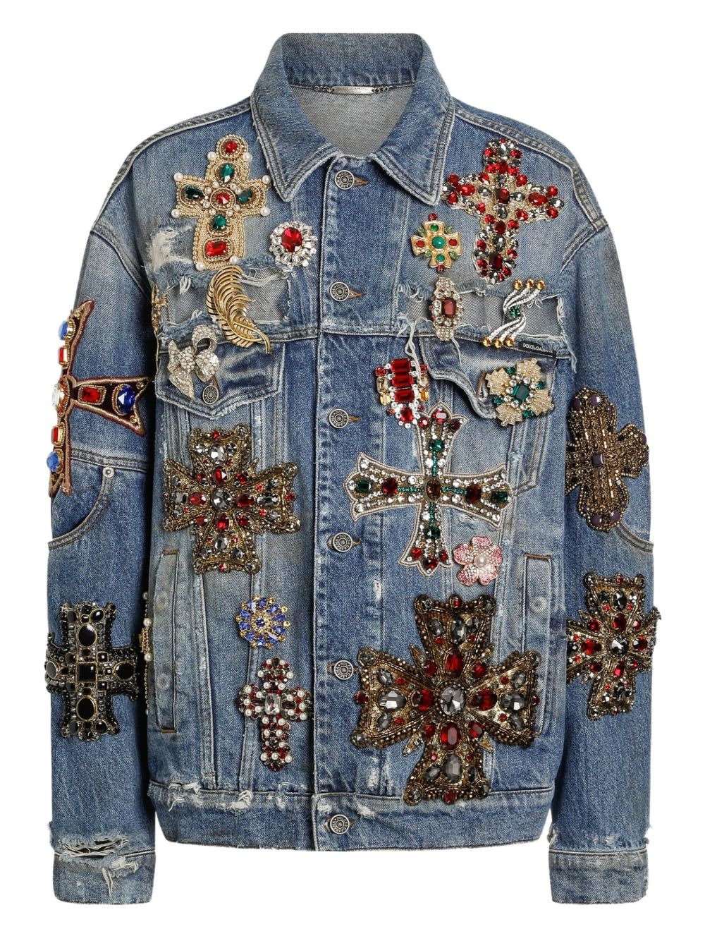 embellished denim jacket Highlights - Light blue - Intricate beadwork - Various cross motifs - Two front pockets - Button-up front - Classic collar Made in Italy Composition Cotton 100%