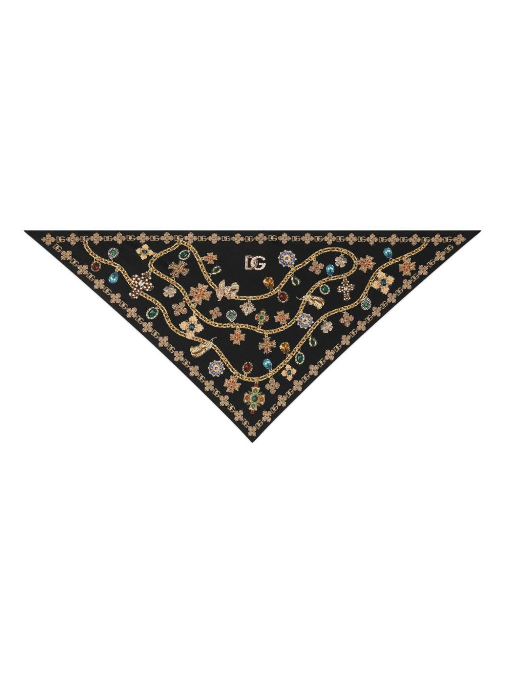 embellished silk scarf Highlights - Black - Chain motifs - Floral and cross embellishments - Logo detail - Gemstone accents Made in Italy Composition Silk 100% SIZE & FIT Measurement LENGTH 53.14 in(135 cm) WIDTH 26.37 in(67 cm) Washing instructions Read Manufacturer Guidelines