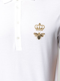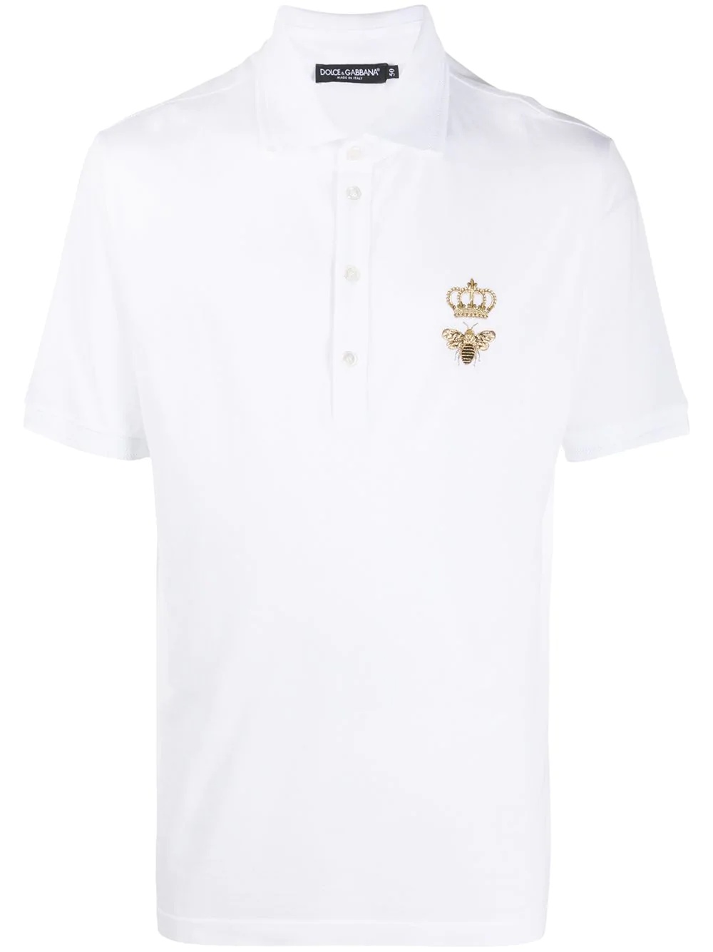 embroidered pique polo shirt Be the bees knees in this embroidered emblem polo shirt from Dolce & Gabbana. The classic polo silhouette is timeless and smart, just like the brand itself. Highlights - White - Cotton blend - Polo collar - Short sleeves - Straight hem. Made in Italy Composition Cotton 95%, Polyester 5% SIZE & FIT Model measurements Height 6 ft 1 in(1.85 m) Bust/Chest 37.79 in(96 cm) Hips 37.4 in(95 cm) Waist 30.7 in(78 cm) FittingInformation Designed for a relaxed fit, this polo shirt offers comfort and movement Made from a midweight non-stretch fabric, this piece offers minimal elasticity when worn This piece fits true to size – take your usual size Measurement CHEST 38.18 in(97 cm) Washing instructions Machine Wash