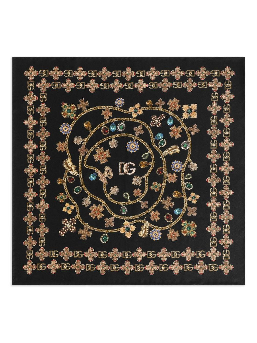 embroidered floral silk scarf Highlights - Black - Floral embroidery - Chain design - Logo detailing Made in Italy Composition Silk 100% SIZE & FIT Measurement LENGTH 19.68 in(50 cm) WIDTH 19.68 in(50 cm) Washing instructions Read Manufacturer Guidelines